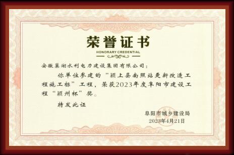 穎上縣南照站更新改造工程施工標(biāo)工程榮獲“穎州杯”獎
