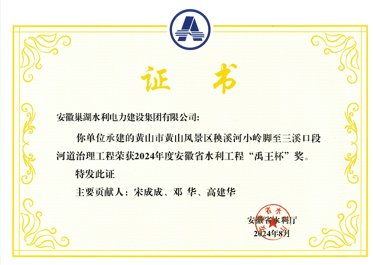 黃山市黃山風景區秧溪河小嶺腳至三溪口段河道治理工程榮獲“禹王杯”榮譽證書